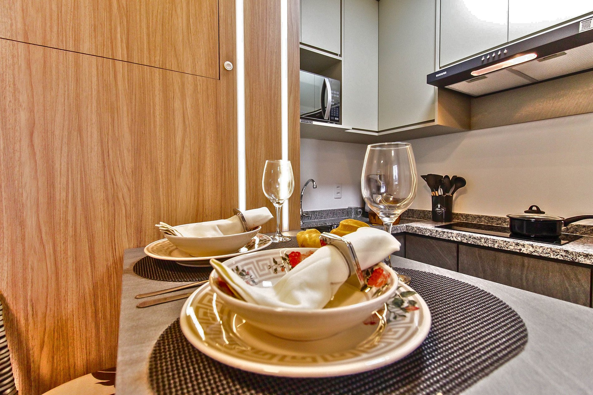 . Utensílios, panelas, pratos, talheres, taças de vinho e copos