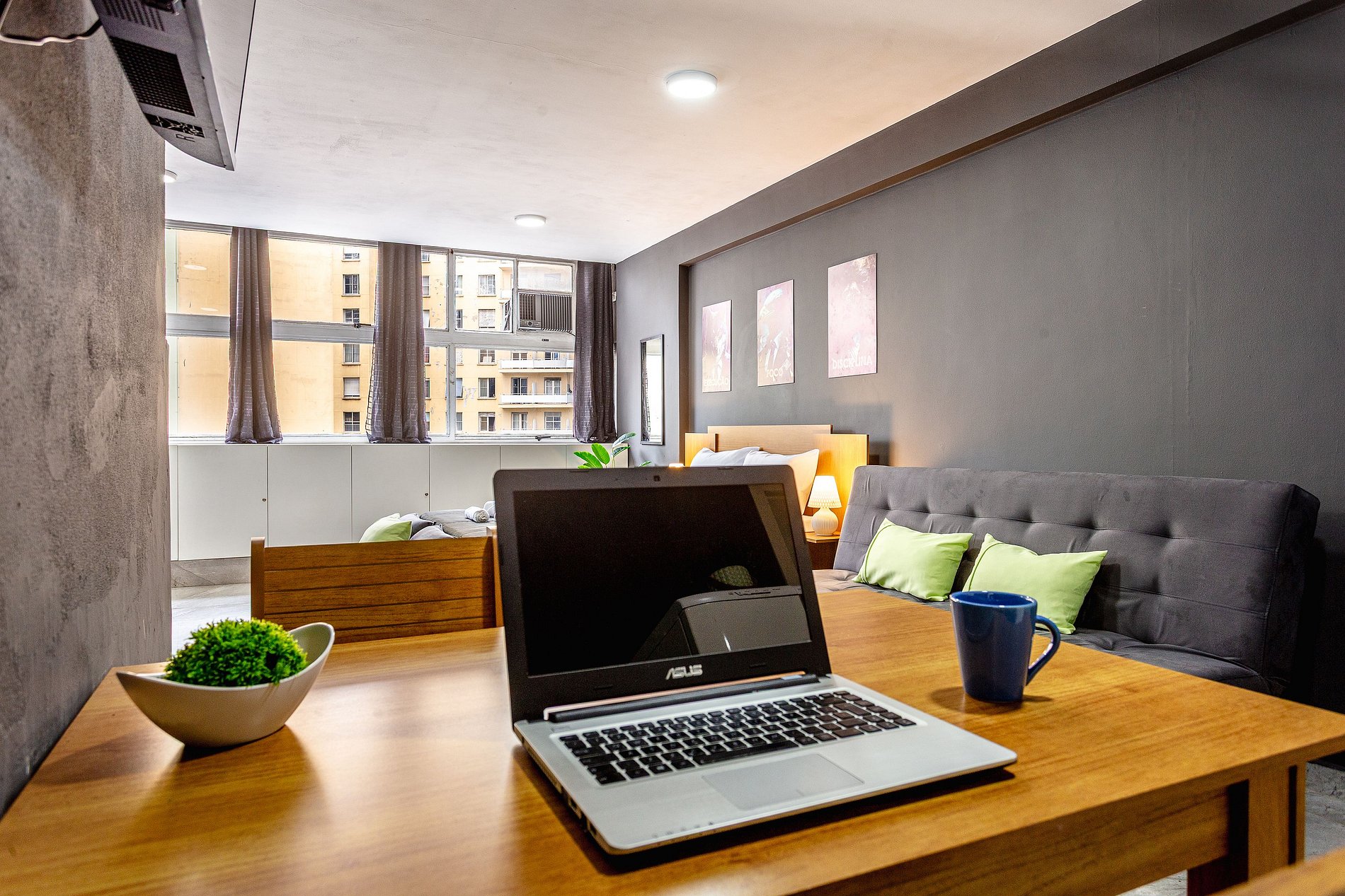 Você vai se hospedar em um studio charmoso no Edifício Mirante do Vale, um dos mais altos de São Paulo.