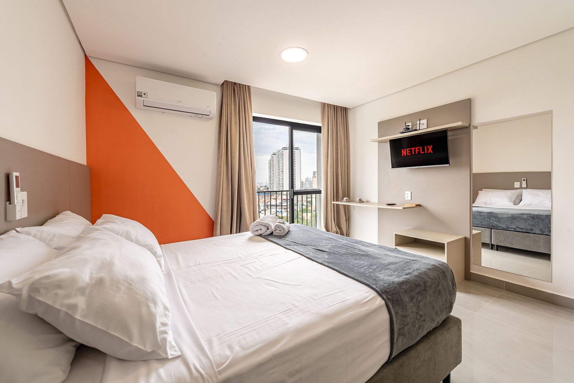 Espaço para até 2 pessoas, com Wi-Fi rápido, Smart TV, varanda privativa e estrutura de resort: piscina, sauna, academia L7 do Lucas Moura, quadras de areia e restaurante.